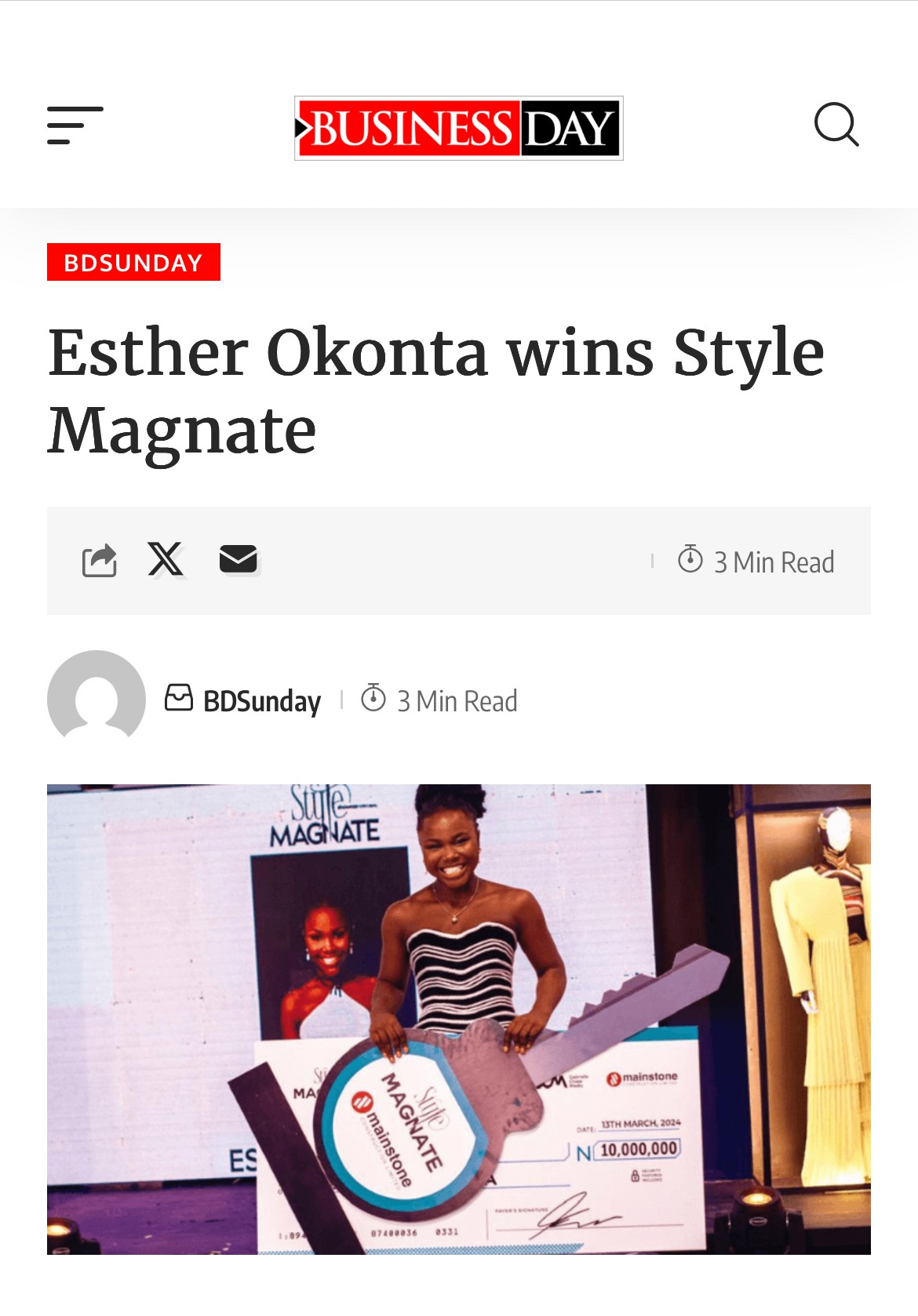 Her dedication to purposeful design has earned her national and international recognition. She is the winner of the Stanbic IBTC FUZE Talent Show and the Showmax Original Style Magnate competition, as well as the first edition of Barefashion Evening runway show. Esther was a Top 5 finalist at Designshark International 2022 and has showcased her work at the Miss Universe Runway for three consecutive years, and at Reroll Station Lab exhibitions in Abuja and London (2025).